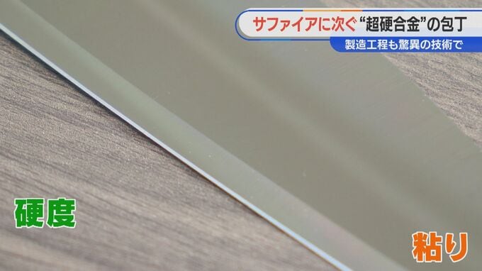 「ただ硬いだけ」では、薄い包丁の刃にすると欠けやすいため、“粘り”も兼ね備えた超硬合金を2年がかりで開発しました。