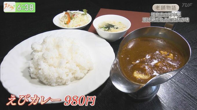 揚げたてのエビを使った人気メニューの『えびカレー(980円)』。哲央さんが考案した料理は、いまもその味が受け継がれています。
