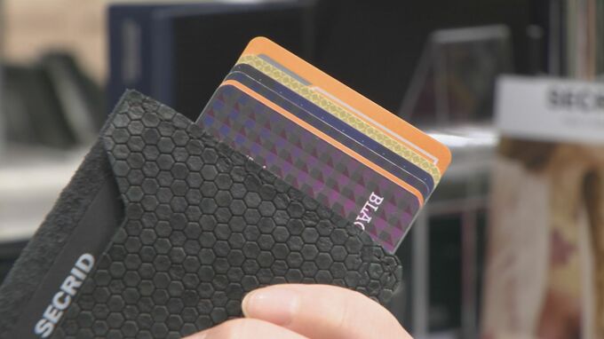ワンタッチでカードが出てくるこちらの財布。キャッシュレス決済の普及で売れ行き好調だといいます。