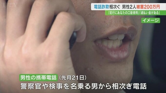 警察によりますと先月21日、男性の携帯電話に警察官や検事を名乗る男から相次いで電話がありました。