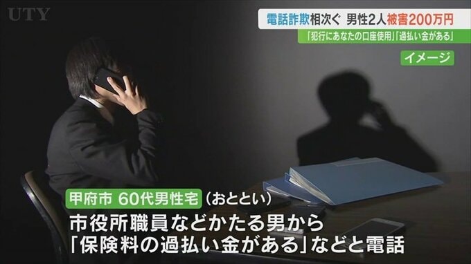 一方、甲府市の60代の男性はおととい自宅に市役所職員などをかたる男から「保険料の過払い金がある」などと電話があり、