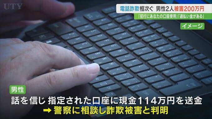 男は「あなたの口座がマネーロンダリング事件に使われている」「現金を送金すれば事件に関与したかがわかる」などと伝え、話を信じた男性は、指定された口座に現金114万円を送金しました。