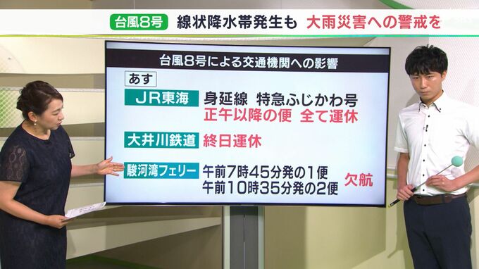 台風8号の接近により、すでに8月13日の運休を発表した静岡県内の交通機関もあります。JR東海は、静岡と甲府を結ぶ身延線・特急ふじかわ号について、13日正午以降に出発する便は全て運休。大井川鐡道は、13日終日、…