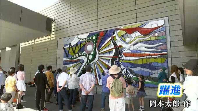 岡本太郎の壁画「躍進」を見て、感想を伝え合います。皆さんは【画像①】の作品を見て、何が見えてきましたか?