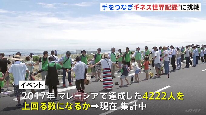 千葉県の誕生150年を記念したイベントがフィナーレを迎え、九十九里浜沿いの道路で参加者が手をつなぐギネス記録に挑戦しました。きょう午前、千葉県の九十九里有料道路で参加者が手を繋ぎ、「手首をつないだ人の…