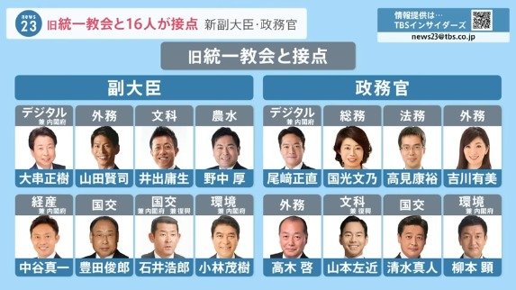 現在のところ、副大臣8人、政務官8人に過去に教団と接点があることがわかりました。