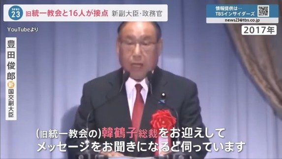 旧統一教会のハン・ハクチャ総裁の名前を挙げて、挨拶したのは国交副大臣に任命された豊田俊郎参院議員です。2017年、千葉で行われた教団関連のイベントに参加していました。