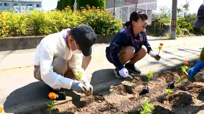 AC長野パルセイロのホームスタジアム周辺に、長野市の地元住民と選手たちが花を植えました。パルセイロのチームカラー・オレンジ色のマリーゴールドを植えるのは長野市篠ノ井地区の住民たちとレディースの選手3人…