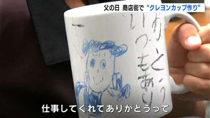 「クレヨンカップ」はマグカップに特殊なクレヨンで絵を描いたもので、子どもたちはお父さんの顔や感謝のメッセージを楽しそうに描いていました。