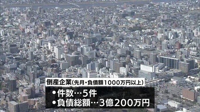 先月、宮崎県内で倒産した企業は5件で、負債総額は3億200万円となっています。民間の信用調査会社3社によりますと、先月、県内で1000万円以上の負債を抱えて倒産した企業は5件で、負債総額は3億200万円でした。負…