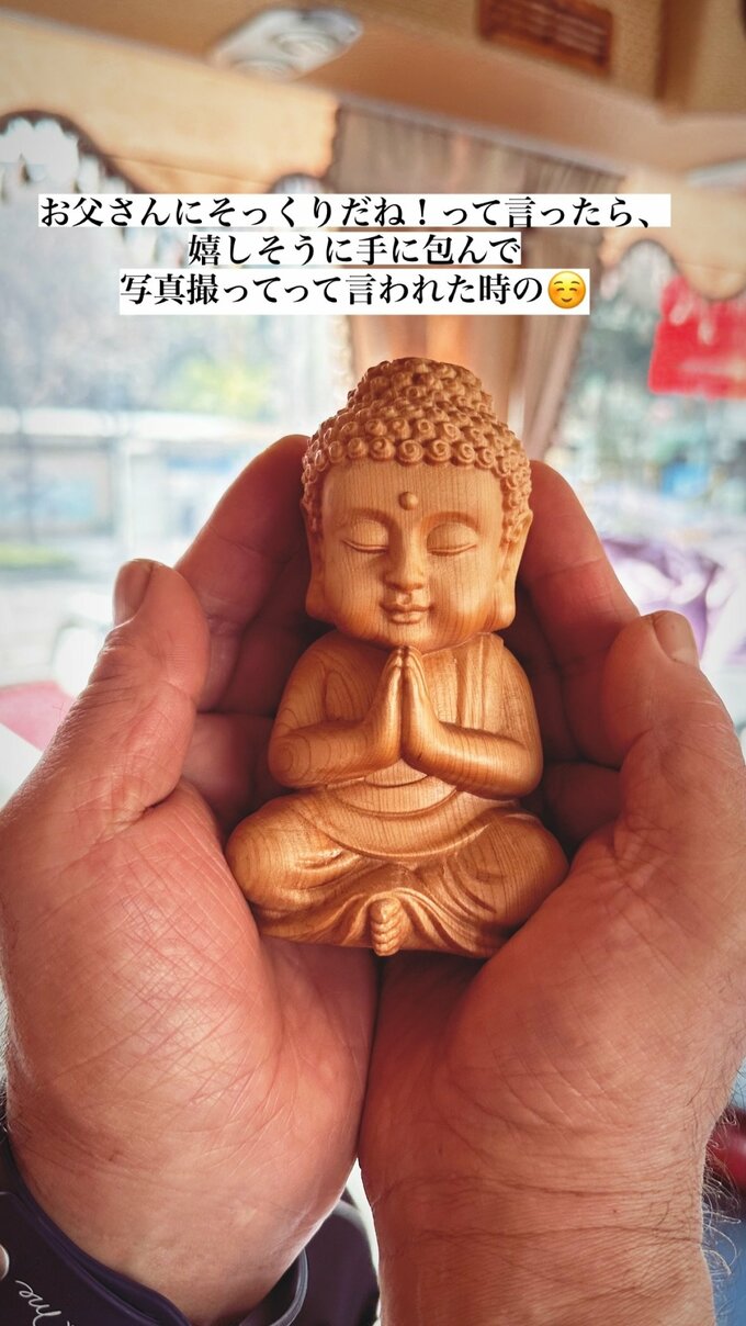 藤岡舞衣さんはインスタグラムのストーリーに、仏像の画像を投稿し「お父さんにそっくりだね!って言ったら、嬉しそうに手に包んで 写真撮ってって言われた時の」と、綴っています。
