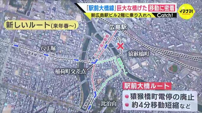 2025年春に開業したら、広島電鉄のルートが大きく変わります。比治山から稲荷町交差点を通って、広島駅に向かうのが、「駅前大橋ルート」です。