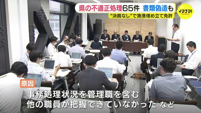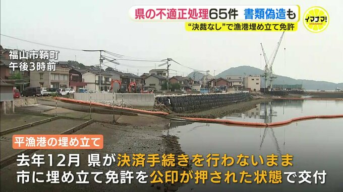 福山市鞆町の漁港の埋め立てについて、県が決裁手続きを行わないまま、市に埋め立て免許を交付していた問題です。県はその後の調査で、書類の偽造4件を含む65件の不適正な処理が判明したと発表しました。
