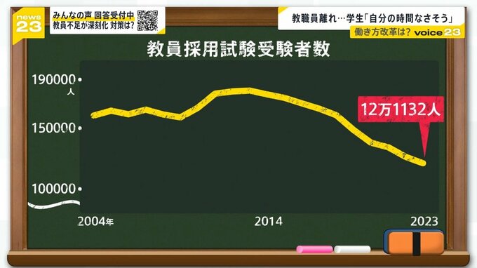 週末(6月15日~16日)に行われた、公立学校の教員採用試験。2023年度の受験者数は12万1132人と、減少の一途を辿っています。