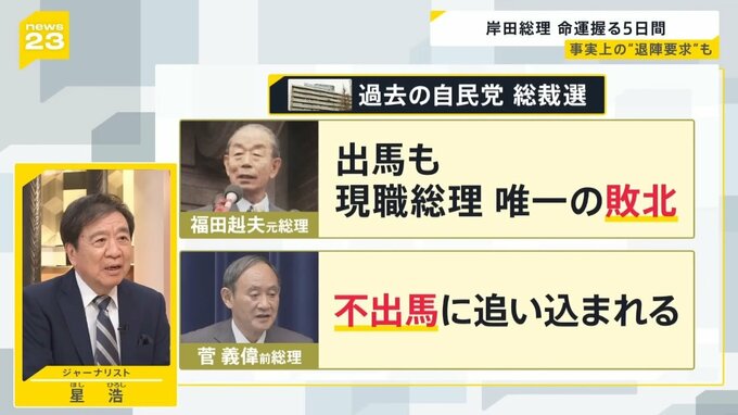 もう一つは3年前の菅義偉さんのように、総裁選挙に出ても勝ち目なしということで、不出馬に追い込まれて退陣をするという事態になりかねません。岸田さんにとっては、まさに茨の道が待っているということだと思います。