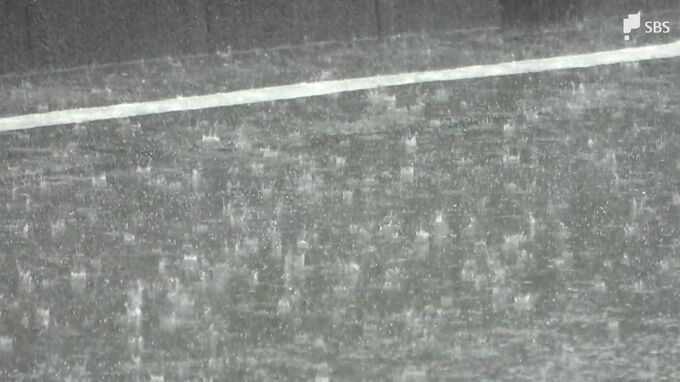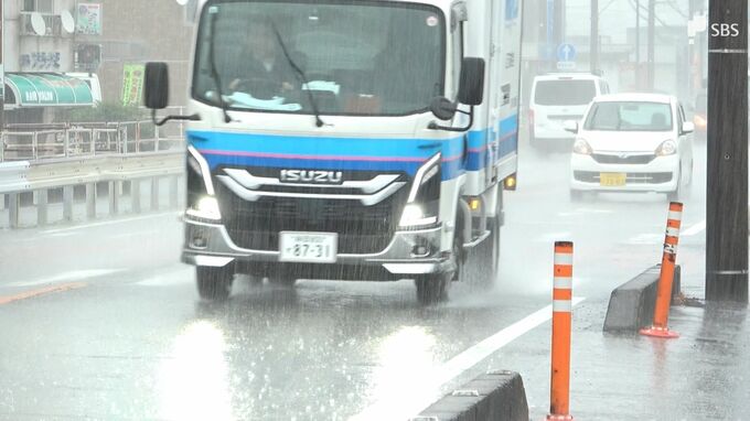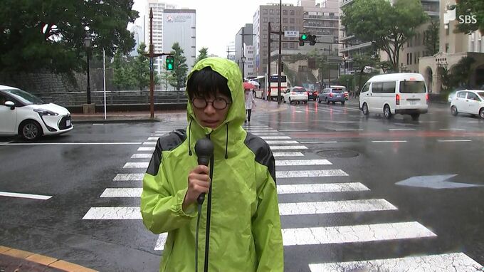 「静岡市葵区です。大粒の雨が絶え間なく降り続いていて、道の脇には水たまりができています」