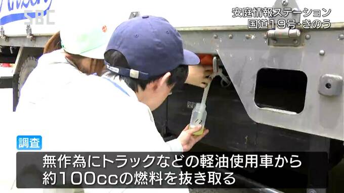 17日は長野市の国道19号で、無作為に止めたトラックなどから、県の担当者が100ccほどの燃料を抜き取りました。