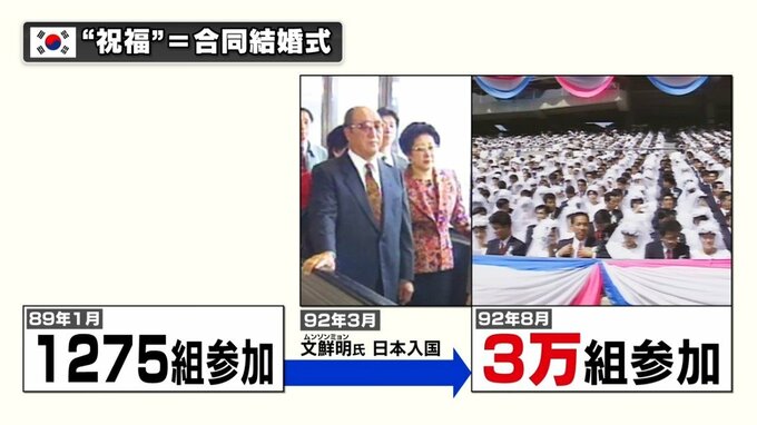 この1992年、日本のキングメーカーがオーソライズしたという形になり、当時の統一教会は日本人信者と献金額を大幅に増やした。その象徴として1989年1275組だった“合同結婚式”が、この年、3万組に急増している。日本の芸能人も参加したことで当時話題となった。