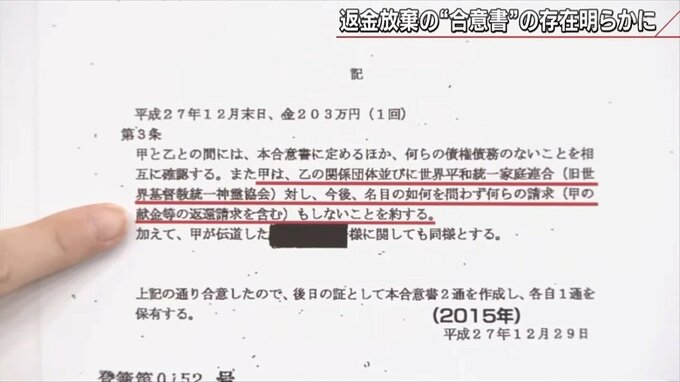だが番組では1つの書面を入手した。「合意書」とある。2015年、教団関係者と元信者との間で交わされたものだ。そこには、元信者が教団から買ったお言葉集の代金など約630万円の返金を求めたところ、203万円が解決金として支払われるかわりに、今後一切、教団に金銭を要求しない旨が記されている。
