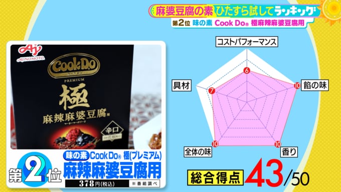 第2位は、味の素の『Cook Do® 極(プレミアム)麻辣麻婆豆腐用』(税込378円 ※番組調べ)。