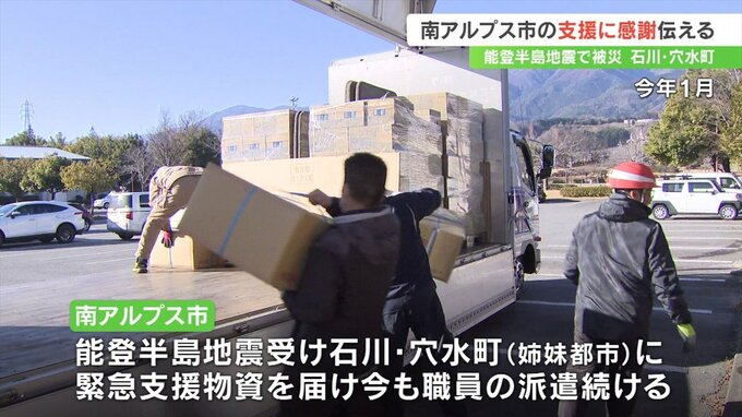 能登半島地震を受けて南アルプス市は姉妹都市の穴水町に緊急支援物資を届けた他今も職員の派遣を続けています。