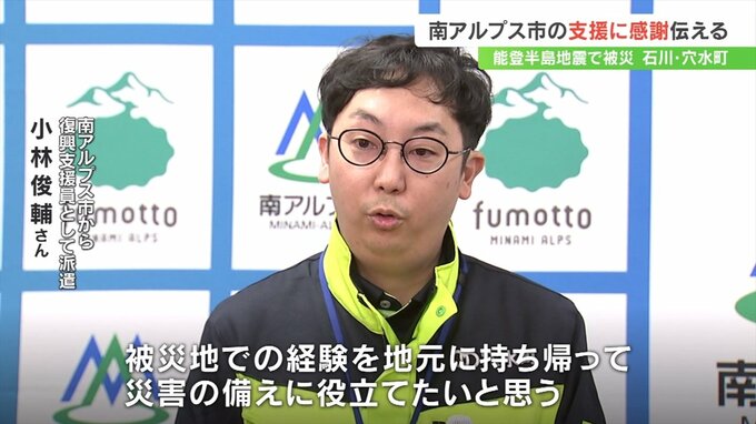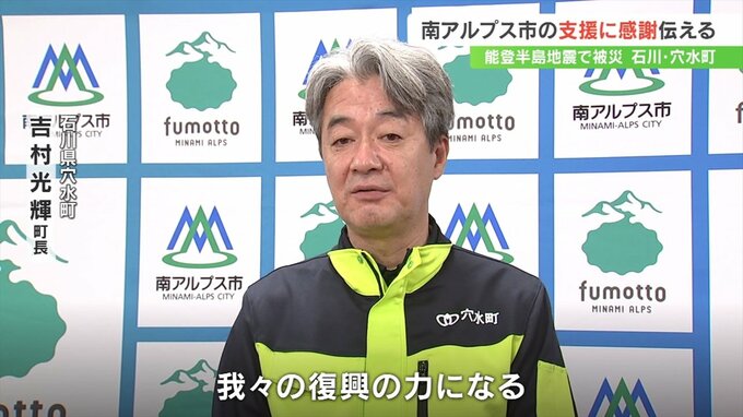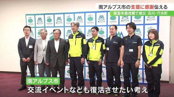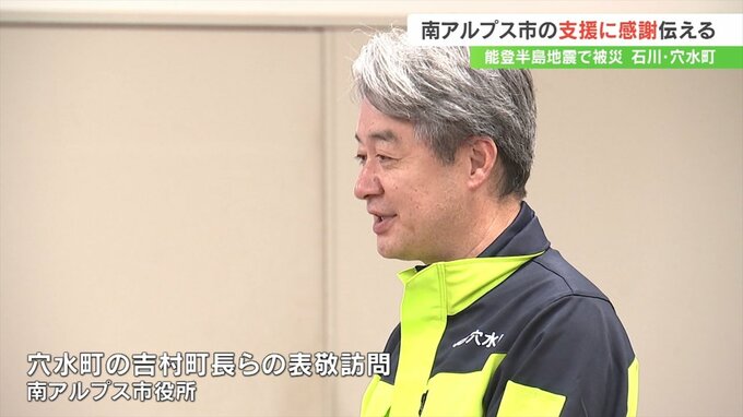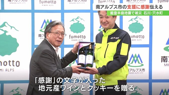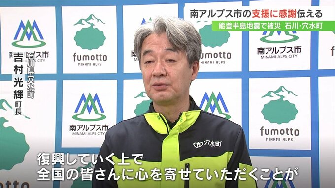 能登半島地震で被害を受けた石川県穴水町の町長らが姉妹都市の山梨県南アルプス市を訪れ復旧に向けた継続支援に感謝を伝えました。