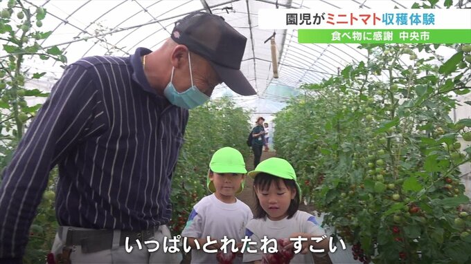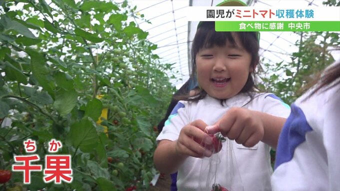 18日に市内の農業用ハウスを田富北保育園と玉穂保育園の園児およそ30人が訪れ甘さと食べやすさが特徴の「千果」という品種のミニトマトを真っ赤に色づいた実を選んで袋いっぱいに摘み取っていました。