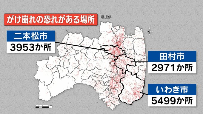 赤く表示されている場所が、土砂災害の中でもがけ崩れの恐れがあると新たに確認された場所で、いわき市や中通りに多く集中しています。最も多かったのが、いわき市で5499か所。次が二本松市の3953か所、田村市の2971か所となっています。
