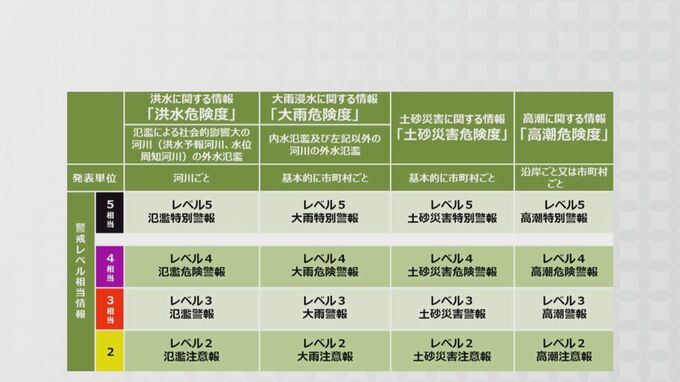 報告書では「洪水」「大雨」「土砂災害」「高潮」の、それぞれの危険度について、警戒レベル5相当は「特別警報」、4相当は「危険警報」、3相当は「警報」、2相当は「注意報」と、シンプルな情報体系と名称に整理することが盛り込まれています。