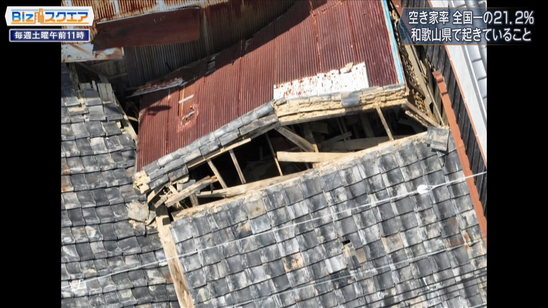 通報のあった空き家を見てみると、広さおよそ46平米の木造平屋の建物で、柱は折れ、壁は斜めに倒れている。さらに、ドローンで上から屋根を見てみると、 後ろ半分が崩れ落ちている。