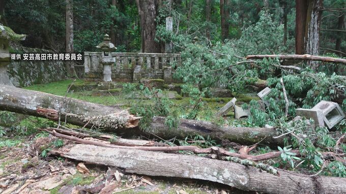 安芸高田市教育委員会によりますと、墓所のそばの斜面にあった高さ30メートルのカシの木が、地上3メートルのところで裂けて倒れ、別の木にぶつかってさらに折れました。この折れた枝が石灯籠にあたり、4基が倒壊したということです。