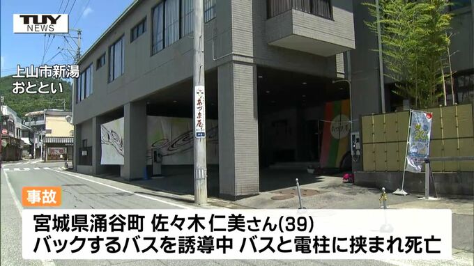 この事故は、おとといの朝、上山市新湯で、宮城県涌谷町に住む佐々木仁美さん(39)が、バックするバスを誘導中に電柱との間に挟まれ死亡したものです。