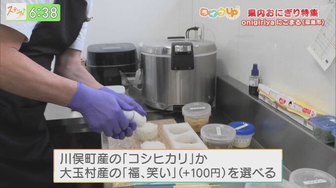 おにぎりは注文を受けてから握るので、出来立てを食べることができます。お米は、川俣町産の『コシヒカリ』と大玉村産の『福、笑い』の2種類から選ぶことができます。