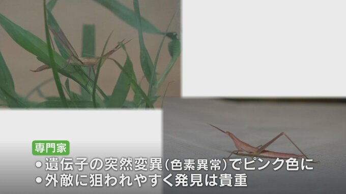 昆虫の専門家は見つかった2匹はショウリョウバッタで、遺伝子の突然変異による色素異常でピンク色になったとみています。