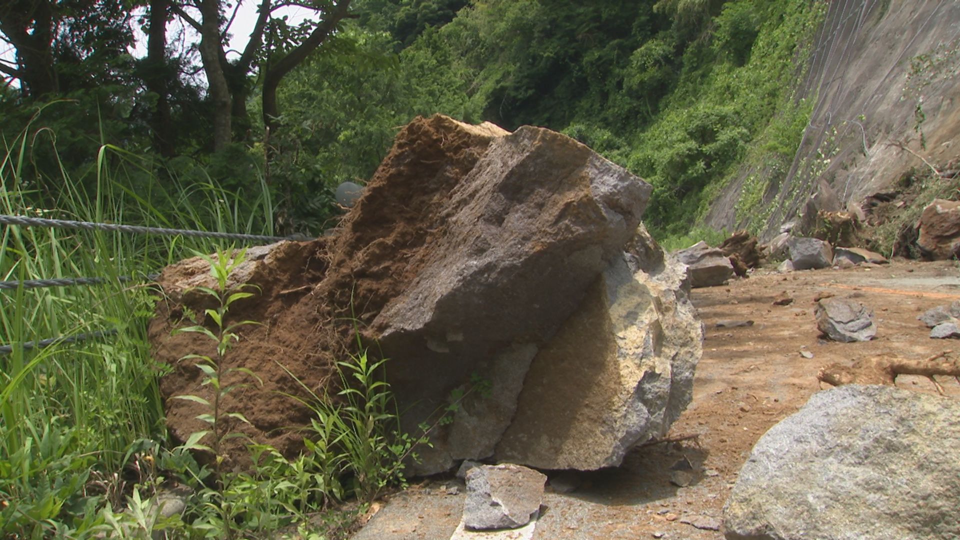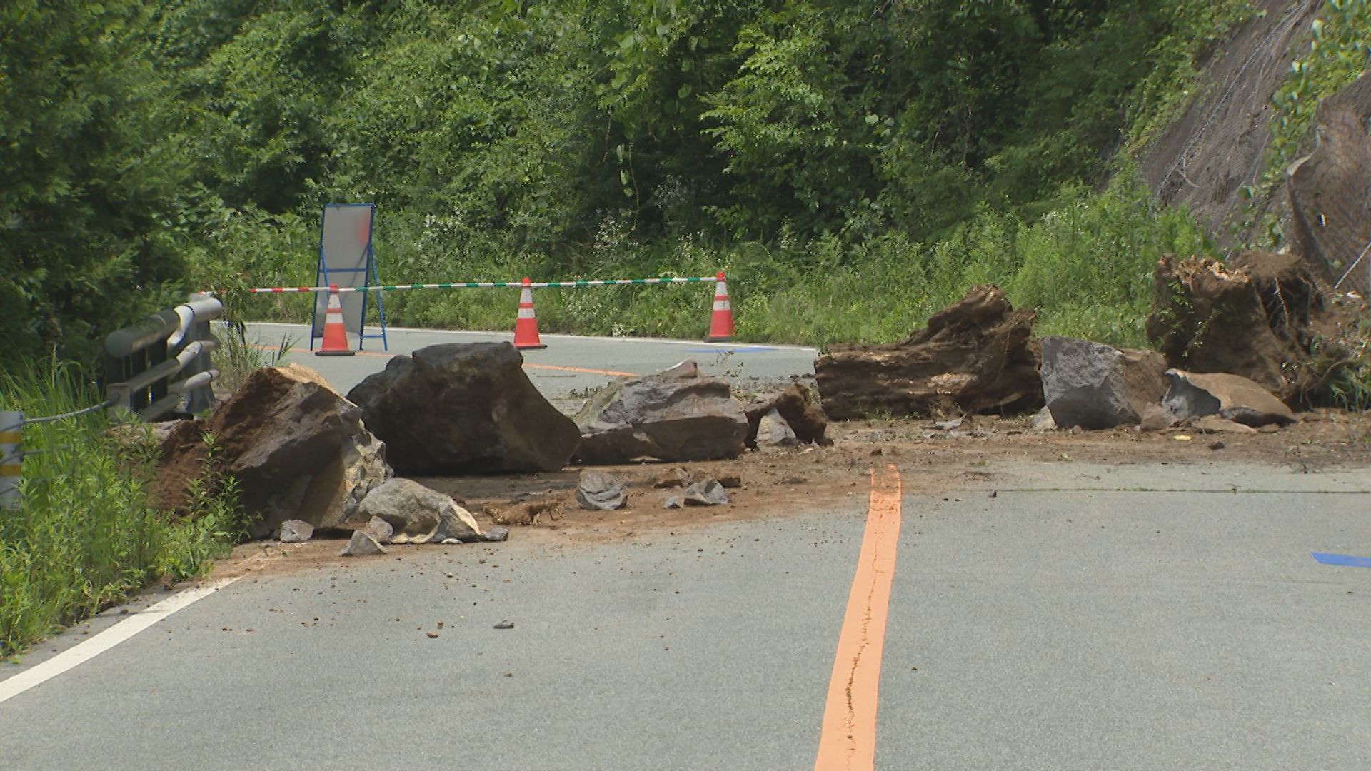 きょう午前6時45分ごろ、住民から「土砂崩れが起きている」と連絡があったということです。落石は大きいもので2mほどあり、のり面の上部、高さ約40mの部分が崩落したとみられます。落石によるケガ人は確認されていません。