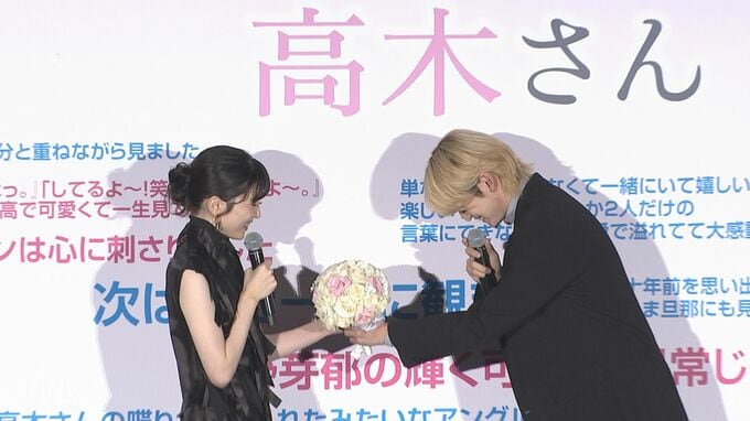 さらに、本作で2人の中学時代を演じた俳優・月島琉衣さん&黒川想矢さんや、主題歌を担当したAimerさん、原作者の山本崇一朗先生からの感謝のメッセージが届き、更に最後は高橋さんから主演の永野さんに感謝の花束を贈呈。