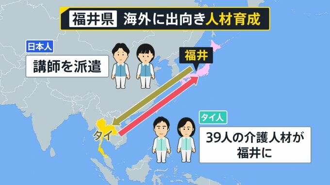 福井県は、海外に出向いての人材育成に取り組んでいます。タイの教育機関と連携し、福井県から講師を現地に派遣、介護や日本語の講習を行っているということです。2022年以降、39人の介護人材がタイから福井にやってきているそうです。