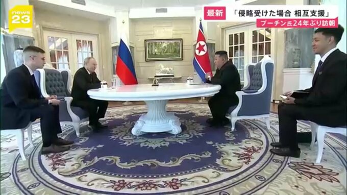 ロシアのプーチン大統領と、北朝鮮の金正恩総書記がパーティーで乾杯。首脳会談後、プーチン氏は「どちらかの国が侵略を受けた場合、もう片方の国が支援することなどを盛り込んだ条約に署名した」と明らかにしました。両国の関係が「同盟関係に引き上げられた」ことで日本を含む東アジア地域の脅威になるおそれも…。(6月19日「news23」午後11時20分すぎの放送より)