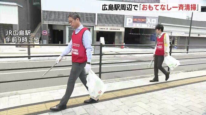 広島の玄関口・広島駅周辺をきれいにして観光客をもてなそうと、20日、一斉清掃が行われました。「おもてなし一斉清掃」は新しい駅ビルの建設や路面電車の高架工事で大きく変わりつつある広島駅南口周辺とマツダス…