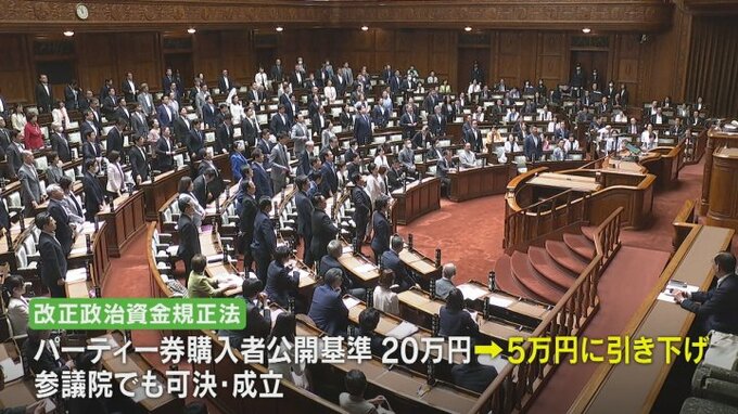 改正政治資金規正法はパーティー券購入者の公開基準を20万円から5万円に引き下げることなどが盛り込まれていて、19日に参議院でも可決し、成立しました。
