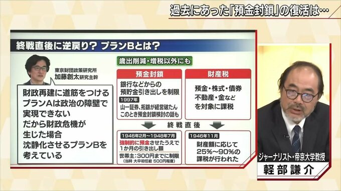 戦後実施された財産税については、憲法上あり得ないというのは時事通信社でニューヨーク総局長、解説委員長を歴任した後、現在帝京大学の教授でもあるジャーナリスト、軽部謙介氏だ。