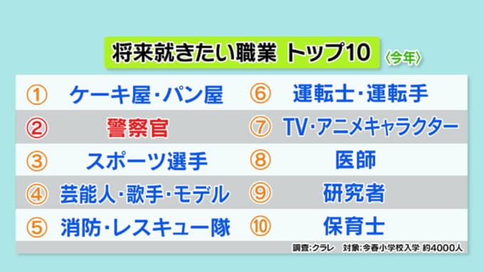 今春入学した小学生4000人に聞いた『なりたい職業ランキング』では、1位はケーキ屋・パン屋さん。2位は警察官、3位がスポーツ選手なんだそうです。