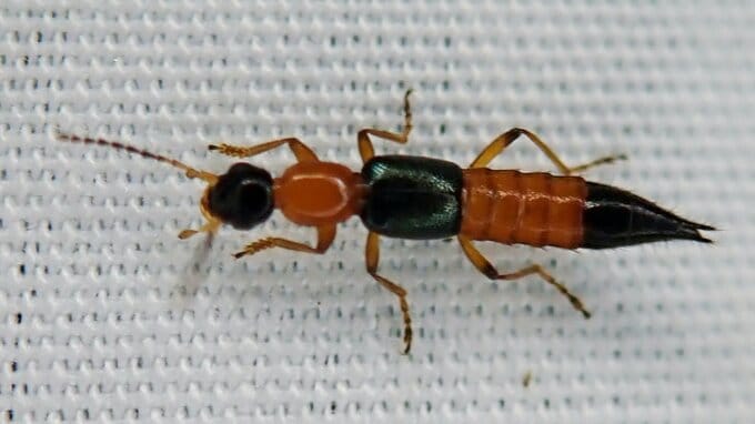 「アオバアリガタハネカクシ」、通称「やけど虫」。体長は6.5〜7.5mm、黒とオレンジの毒々しい色で、背中には青みがかった羽。アリのような形をした虫です。