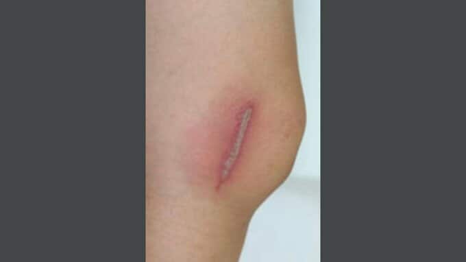 周囲が赤く腫れ、線状のやけどのような傷。