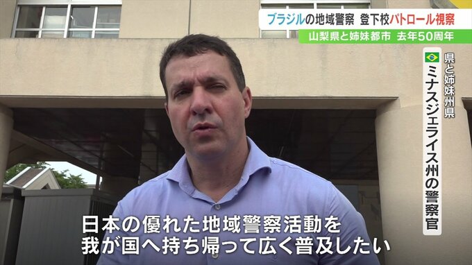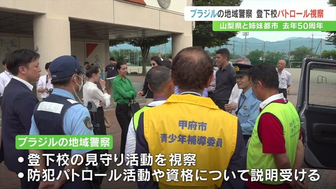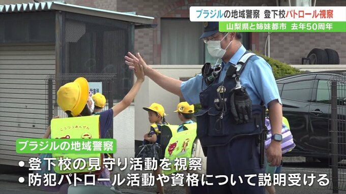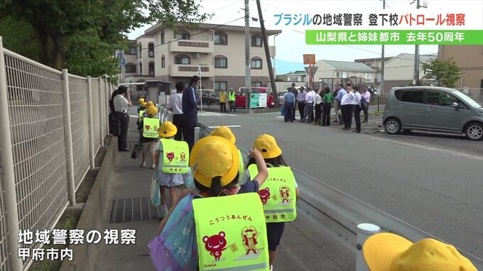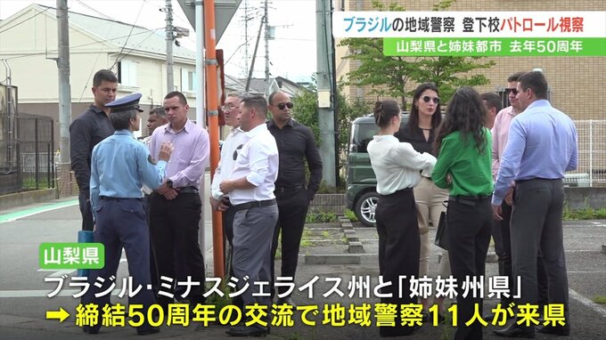 山梨県と姉妹州県のブラジル・ミナスジェライス州の警察のメンバーが来県し、甲府市内で登下校のパトロールを視察しました。