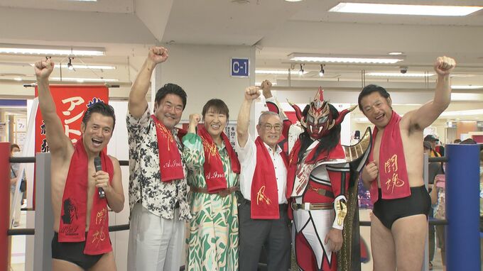 獣神サンダー・ライガーさん、佐々木健介さん、北斗晶さん、アントニオ小猪木さん、アントキの猪木さん、実弟の猪木啓介さんが「超・燃える闘魂 アントニオ猪木展」のオープニングセレモニーに登壇しました。