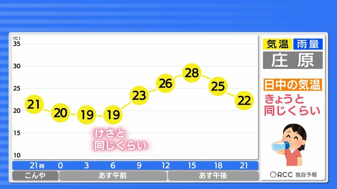 朝の気温は、けさと同じくらいでしょう。日中の気温はきょうと同じくらいからきょうよりも4℃ほど高くなる予想です。あすも湿度が高いでしょう。