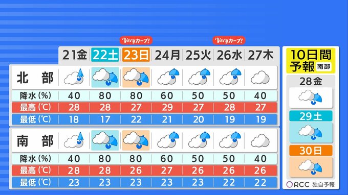 あす以降、しばらくぐずついた天気が続きます。週末はまとまった雨になるでしょう。中国地方の梅雨入りは、あさって土曜日に発表される可能性が高くなっています。仮に6月22日に発表となると、観測史上3番目に遅い梅雨入りとなります。梅雨入りは遅れましたが、6月から7月の降水量は、平年並から平年より多い予想ですので、短期間に雨量が多くなる可能性もあります。今のうちからできる備えをしっかりとしていきたいですね。