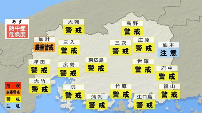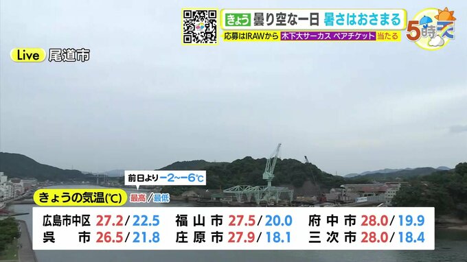 きょう20日(木)の広島県は、午前中は薄日が届いた時間もありましたが、一日雲の多い天気となりました。日差しがあまり届かなかった分、最高気温はきのうよりも低くなりました。府中市や三次では28℃、広島市中区では27.2℃、福山では27.5℃となりました。最高気温は、きのうと比べると2℃~6℃ほど低くなりました。