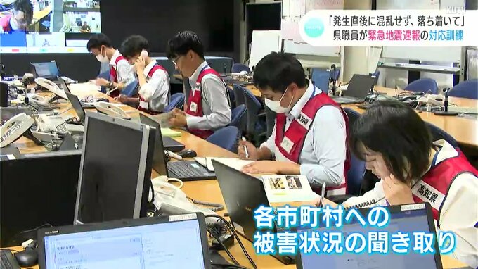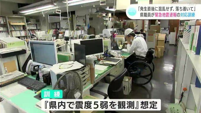 訓練は県内で震度5弱の地震が観測されたという想定で、県庁では職員らが緊急地震速報のアラームを聞くとすぐに机の下に隠れるなど身を守る行動をしました。